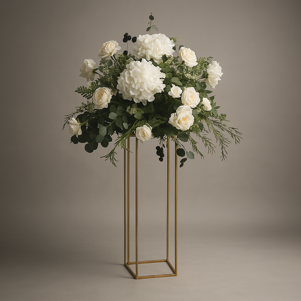 Élevez votre décor avec cet arrangement floral raffiné composé de roses ivoire, de pivoines et de feuillages luxuriants. Présenté sur un support doré minimaliste, il ajoute hauteur et élégance à vos événements. Parfait pour les mariages, galas ou cérémonies haut de gamme.