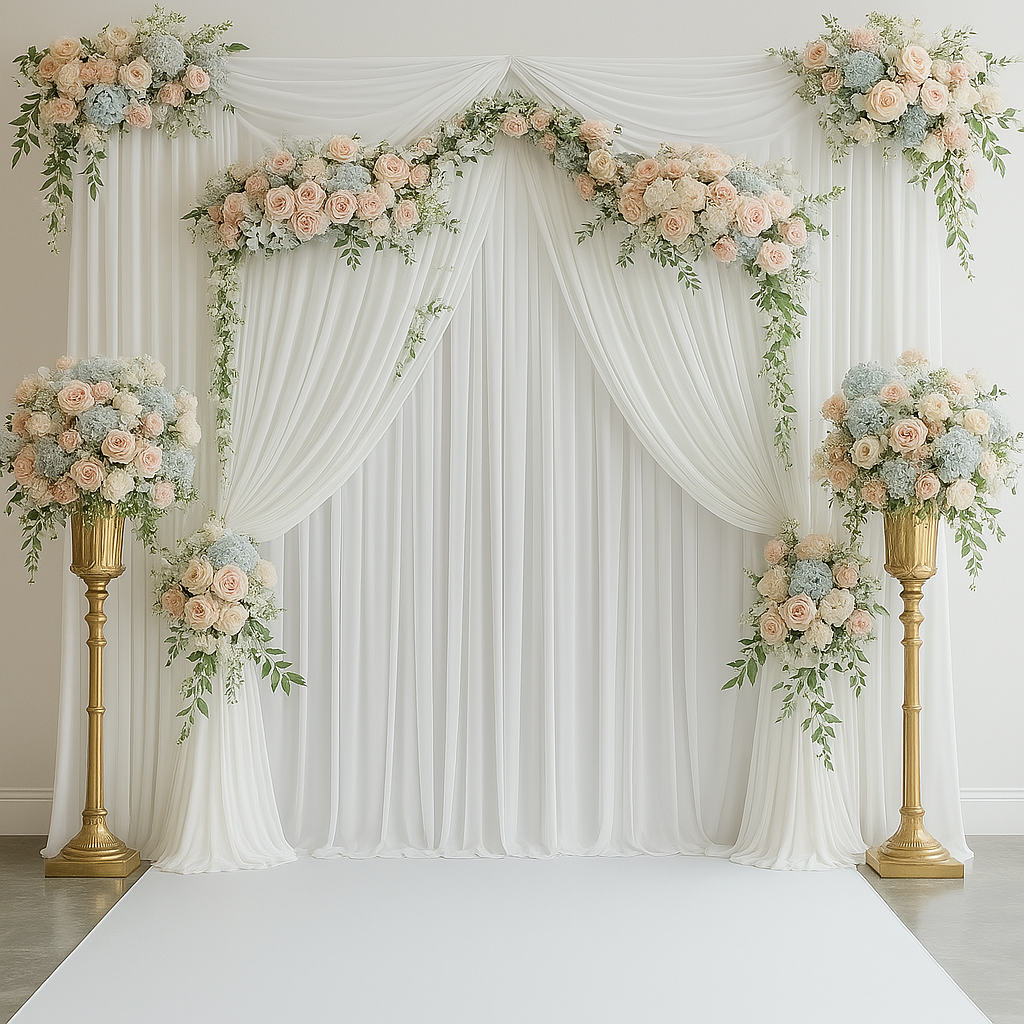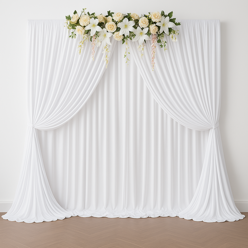 Ajoutez une touche de raffinement à votre événement avec notre mur rideau blanc fluide, parfait pour les cérémonies, séances photo ou décors de fond. Possibilité d’ajouter des arrangements floraux élégants et personnalisés. Service d’installation disponible en supplément.