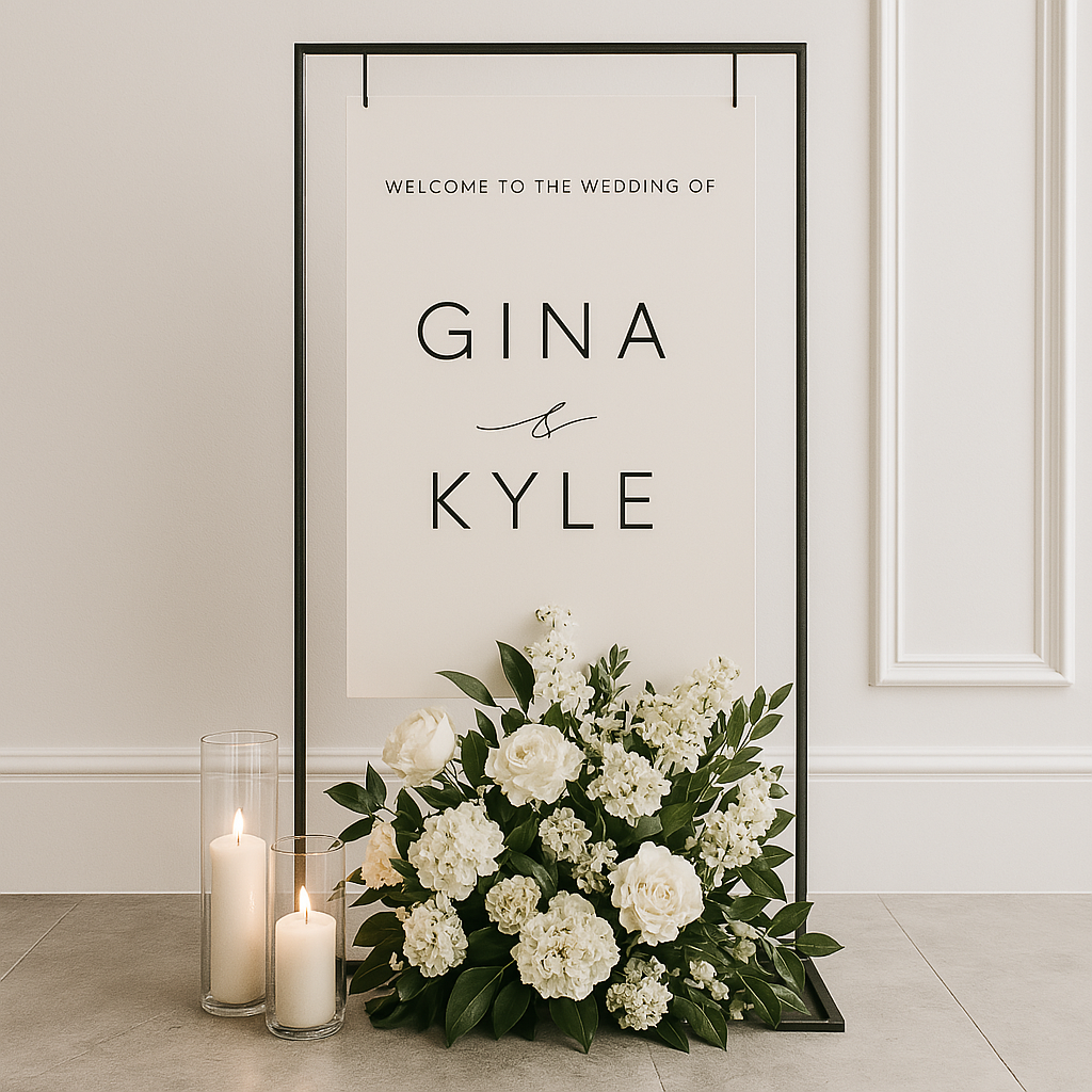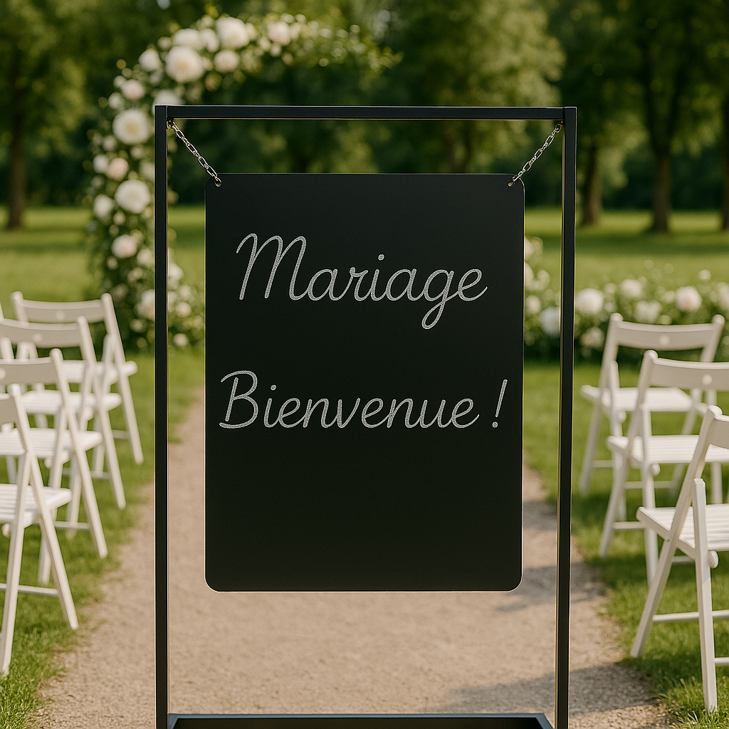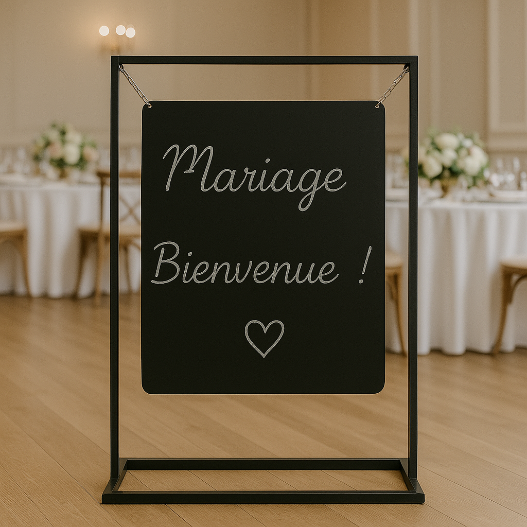 Apportez une touche chic à votre événement avec ce support de panneau suspendu, parfait pour accueillir vos invités. Son design épuré et moderne s’adapte à tous les styles de mariage, du plus classique au plus contemporain. Personnalisez le message pour créer une première impression mémorable.